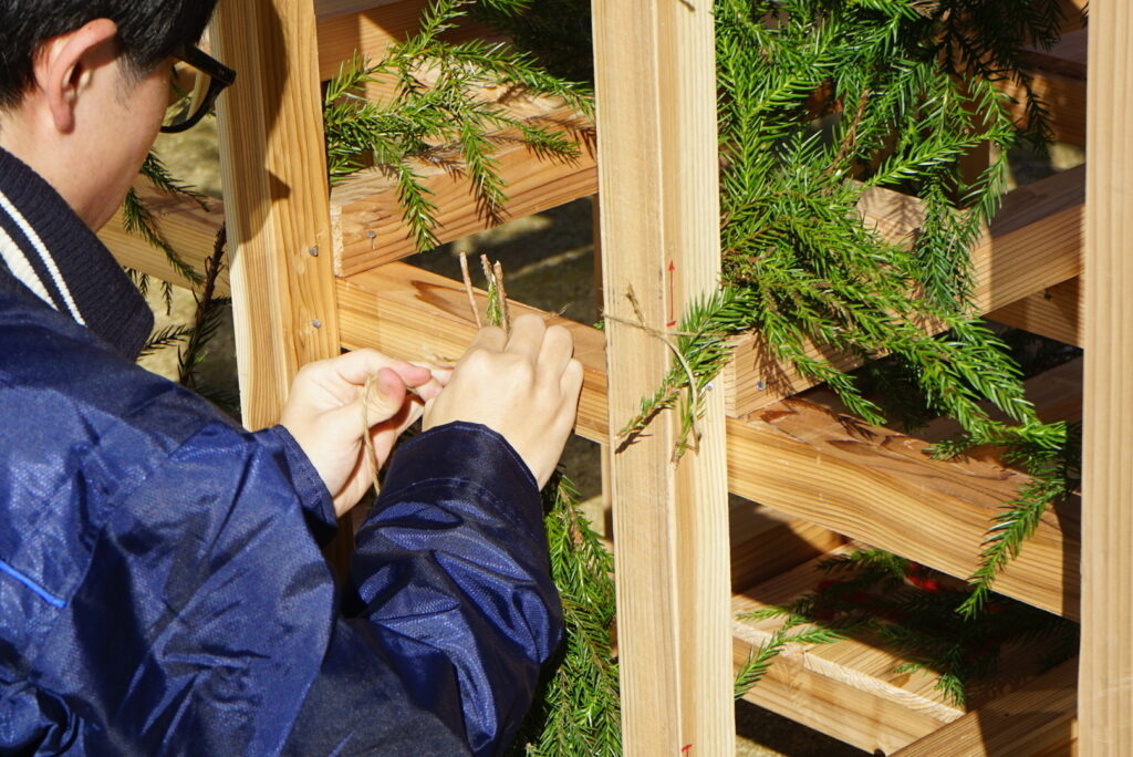 午後からは山村広場で遊び道具の製作を開始しました。参加者は全15班に分かれ、積み木、クリスマスツリー、ログハウス、パズル、モルック、輪投げなど、参加者が協力して作品作りに取り組みました。