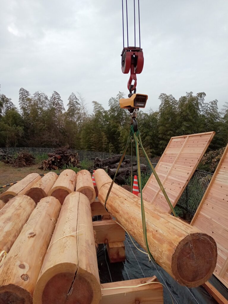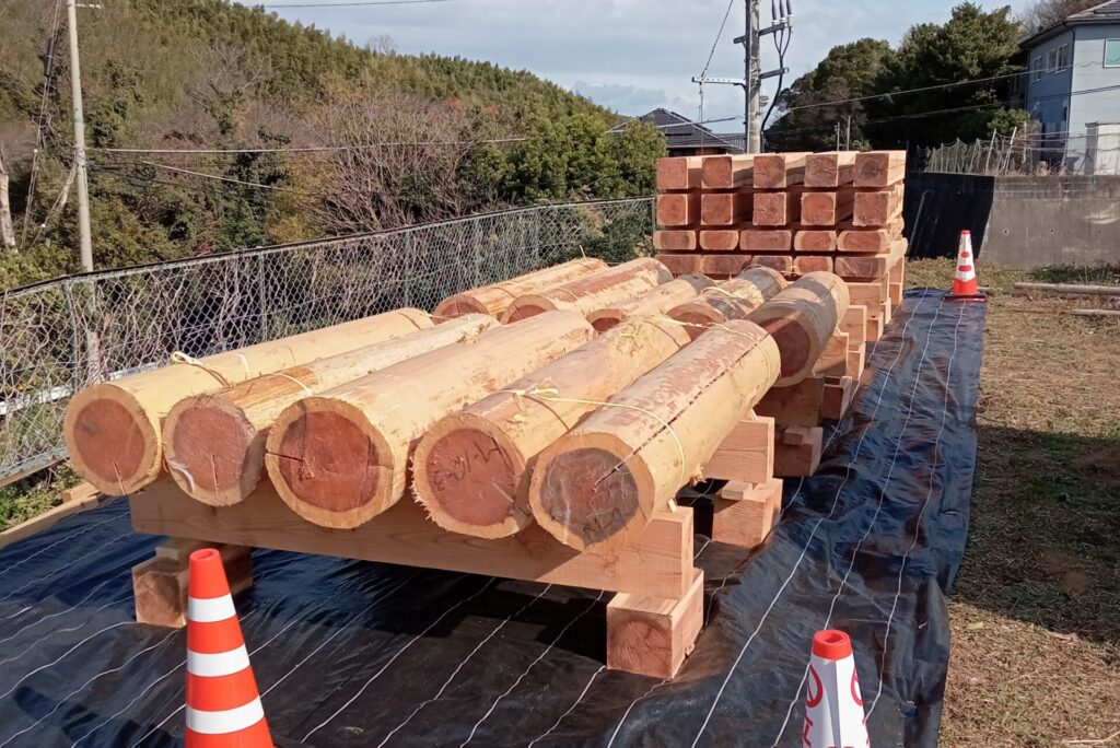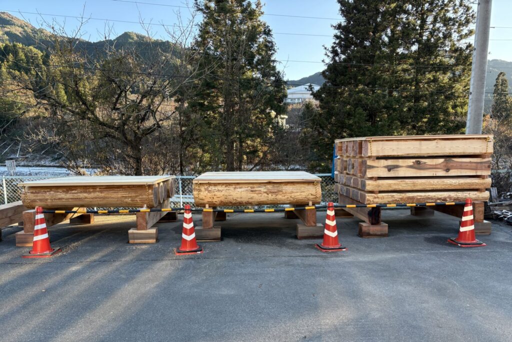 人工乾燥に頼らない、新たな木材活用。建築用材としての実用化を目指し、正角・太鼓・丸太の3種の形状で大径材の天然乾燥比較試験を根羽村森林組合が実施