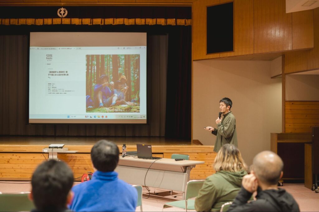 現在、村内で実際に起きていることとして、まず「信州やまほいく」の取り組みが挙げられます。園児たちが里山で過ごす中で、今や親世代よりも子どものほうが里山活動に詳しくなるという変化が生まれています。また、村外との交流も盛んで、愛知県安城市の子どもたちによるデイキャンプやJR東海の親子向け活動、さらには名古屋で村の丸太を活用する「森との暮らしLAB」など、里山活動は都会の人々がお金を払ってでも参加したいものになってきており、世間的にも追い風の状況にあります。