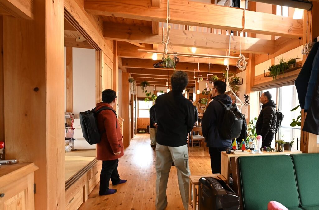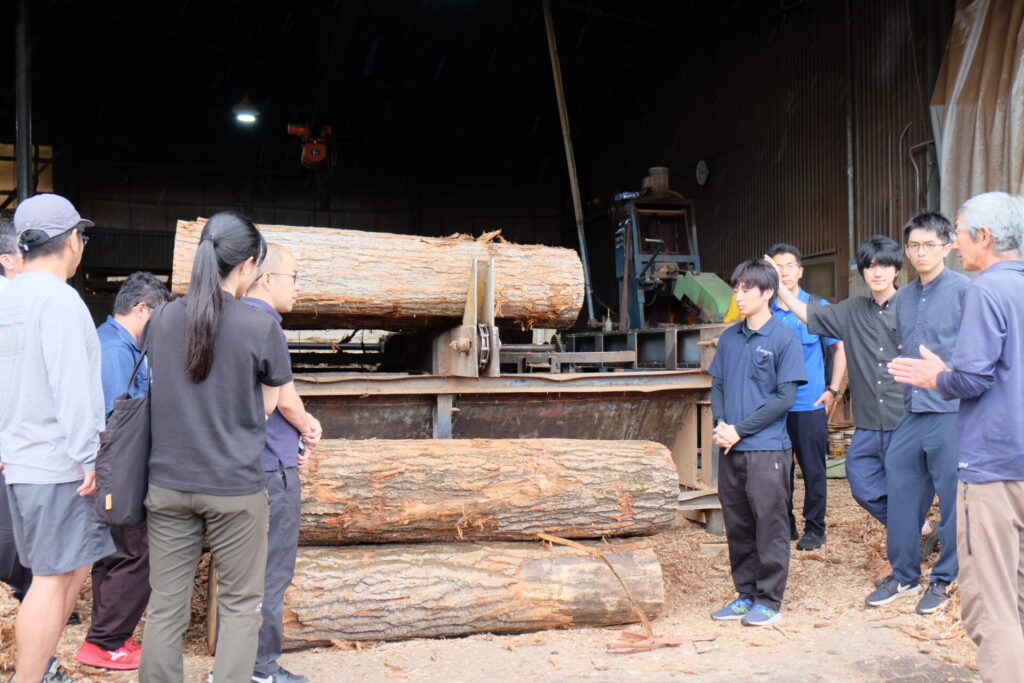 岐阜県飛騨市では、地域が一体となって広葉樹の利活用に取り組む現場を見学。東京の檜原村に拠点を構える東京チェンソーズでは、都市の森で林業の意義をどう伝え、どう事業化しているかを学びました。国産材を取り扱うログハウスメーカーとはモデルハウスを前に意見を交わし、大径材を「そのまま生かす」建築の可能性と、乾燥・加工という現実の壁を体感しながら、連携できる方法を模索しました。滋賀県の大喜工務店では、ヒノキならば1尺角で10年、ケヤキは30年という歳月をかけて天然乾燥を行い、広告宣伝費をかけず営業マンも一人も置かないのに、良いプロダクトの口コミで客が絶えないという異色の経営手法を目の当たりにしました。