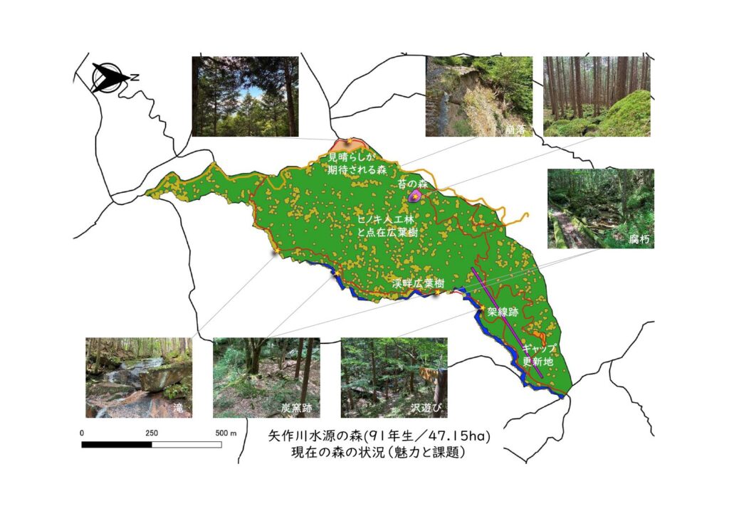 そして「どう森をよくするか」という問いに長い時間軸で向き合う取り組みも動いています。根羽村と愛知県安城市が共同で管理してきた「矢作川水源の森」のリデザインと、コンセプトマップの策定です。信州大学の研究者とともに現地調査を重ね、源流林業の森・渓流の森・集いと学びの森など複数のゾーンに分けて、15年後の森の姿を描いています。矢作川流域に暮らす約112万人の生活を支える水の源として、この森が果たしている役割を「目に見える形」で伝えること。流域の企業や市民が「この森に関わる意味」を実感できるようにすること。そのストーリーを、今まさに描いているところです。